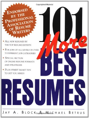 101 all-new resumes from America’s top resume experts Land your dream job with the perfect resume! Jay A. Block and Michael Betrus — the experts behind the bestselling 101 Best Resumes — have put together 101 More Best Resumes to give you the edge in today’s fiercely competitive job market. It’s bursting with insights, phrases and formats that generate high-energy ways to sell yourself to employers. You get examples of outstanding resumes for jobs in 70 different categories and for every level of skill as you pick up all the ingredients that every great resume must have. You learn how to: *Create targeted resumes for specific jobs *Compose a resume that builds your confidence *Create a resume that meets the needs of today’s employers You’ll also find a special online resume formats and strategies...200 street-smart tips for getting hired...unconventional ways to find jobs...tips for negotiating a higher salary....writing action-oriented cover letters -— and much, much more!
